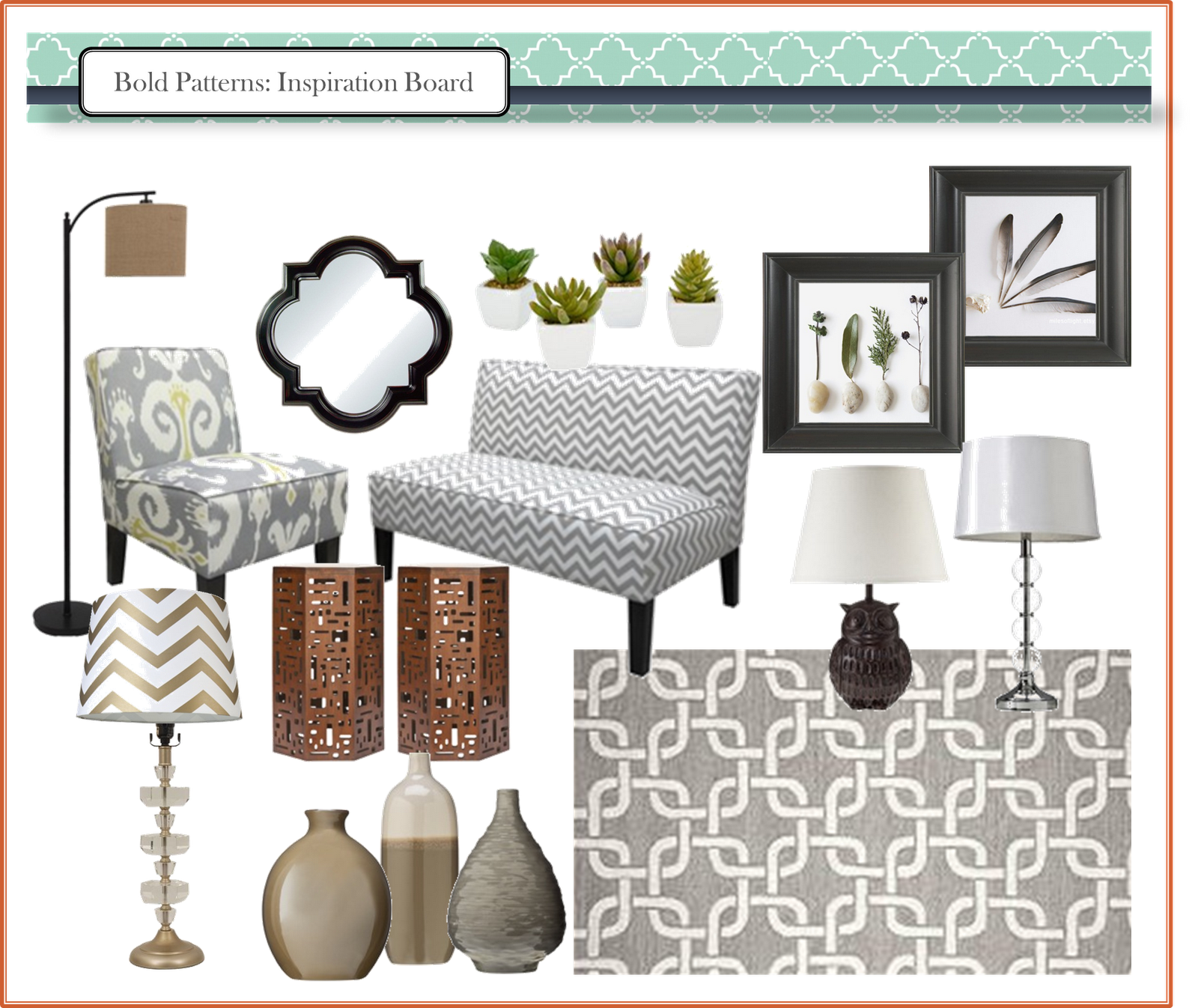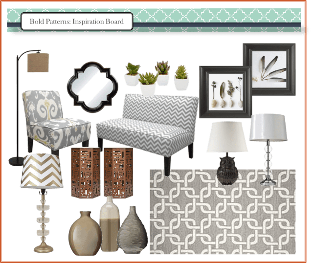 So here we go – I’ve exercised my mind, and put together an inspiration board based on patterns – lots of them.  I’ve chosen a muted palate of dove grey, taupe, yellow and gold (sounds strange, but I think it works).  Mixing in earthy touches balances the patterns, and somehow comes together for a eclectic yet classic look (I’m pretty sure that “classic eclectic” was not a category, but it is now).