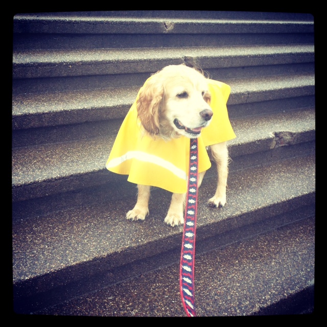 It’s been raining here, so last night Leo and I went on a very wet walk after work. As you can see, he was pleased as punch with himself in his little raincoat. Look at that sassy face! I may just keep him 🙂