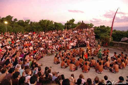 The show begins at 6:00pm nightly. Hire a taxi to drop you off at Ulu Watu temple. Once there, follow the crowds to the performance area. It is perched on the cliffs at the southernmost tip of Bali. Your driver will undoubtedly offer to take you to a Jimbaran seafood dinner after the show. Decline this service. It is an expensive tourist trap.