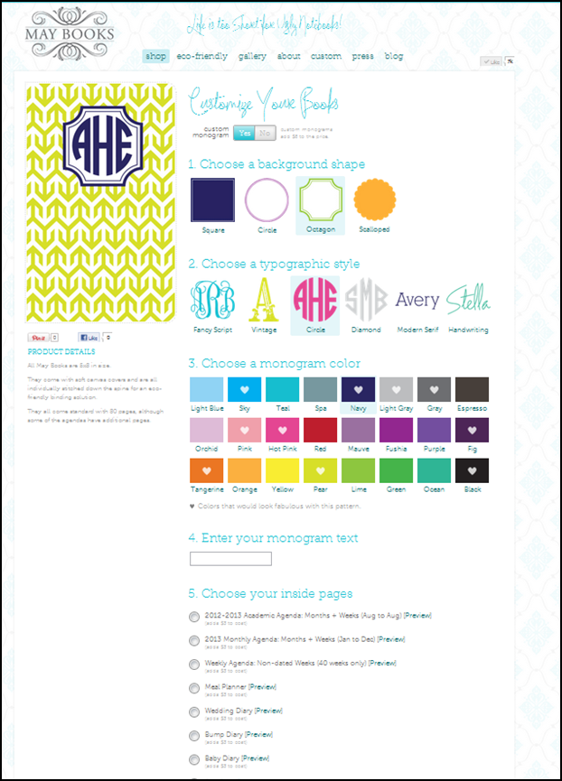 After you’ve picked your pattern out, you can customize your notebook with a monogram (obsessed)! Done and done!