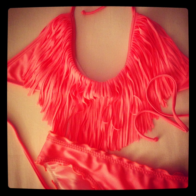 After work last night, I headed to Union Street in the Marina, to meet my soulmate… my bikini soulmate that is. She is the color of orange sherbet, and has an amazing fringed top. I am 99% sure I “pinned” this bikini on Pinterest at the start of summer, and now it’s mine… all mine!!