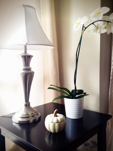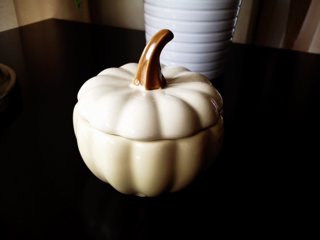 My favorite things?? This awesome little white pumpkin dish – right now it’s empty, but I plan on getting some candy corn in there ASAP. I happen to love me some candy corn, and eat it by the handfuls every Halloween.