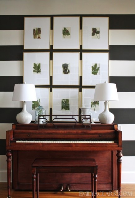 As a graphic backdrop in a more traditional setting (with botanical gallery wall and antique piano)…