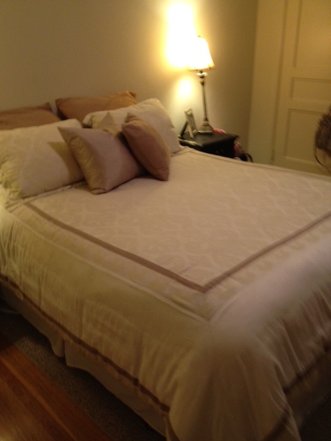 Let’s start with the Bedroom. Soak in this god awful “before” picture… this one was taken just after we moved in… you can’t see the wall of boxes at the foot of the bed… this was the “good” area so you can only imagine what it looks like outside the frame. With this horrid image in your mind, you’ll really be able to appreciate the improvements, as I post some “afters” this year.
