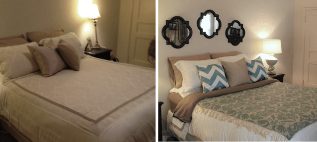 A month or so into living here, I hung a few mirrors, replaced the lamps, flipped over the duvet, and added a few new throw pillows. A slight improvement, but still… blah.