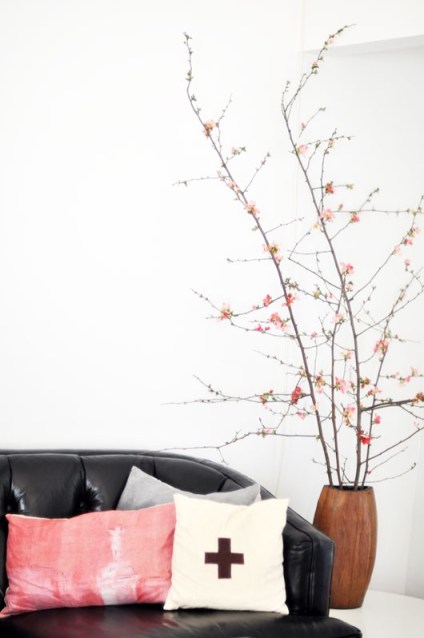 Was the matching pink pillow planted here just to pick up the color in the blossoms? Genius. Feminine and masculine (with that black leather) all at the same time!
