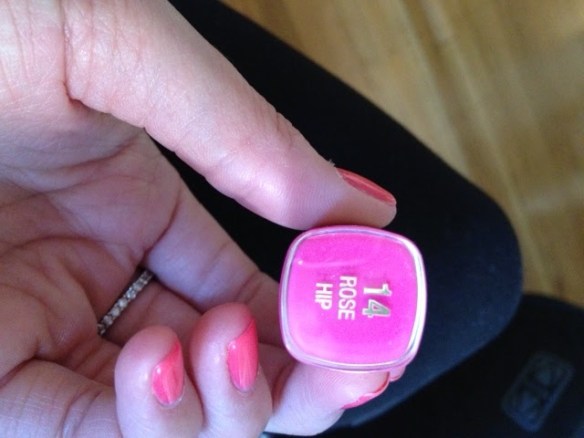 The color is called rose hips, although to me it’s a much brighter pink than any flower I’ve ever seen.  Depending on the application, it ranges from magenta (lighter application), to almost neon (two thick coats, blotted).