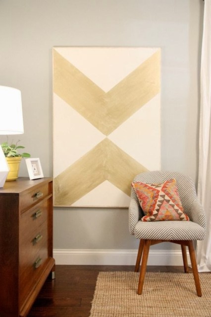 This DIY painting hardly needs explanation, because all you need is some painters tape and the ability to measure the halfway points on the canvas… if you don’t have a single “artistic” bone in your body, then this is the DIY paint project for you.