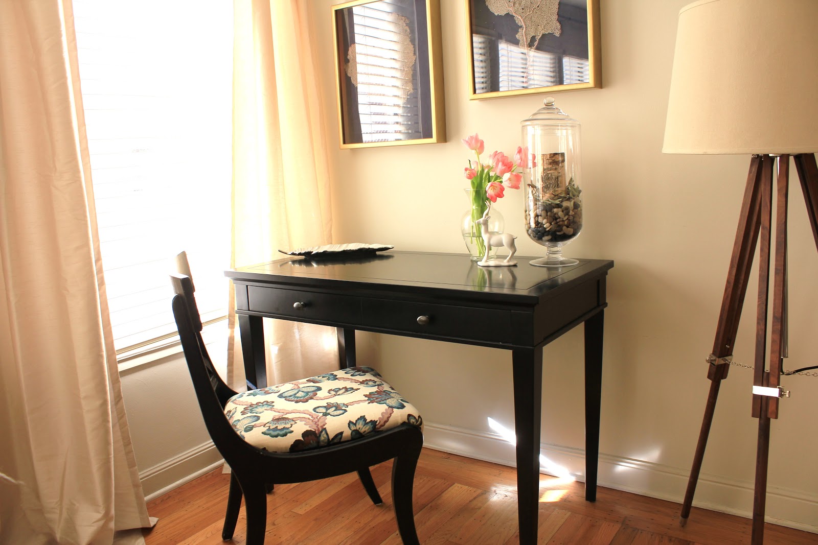 And just for fun, here is a photo with the new lamp in place… that inspiration board I put together is really coming together! I am absolutely LOVING the desk next to the window, and the light from that enormous lamp shade is just so pretty at night.