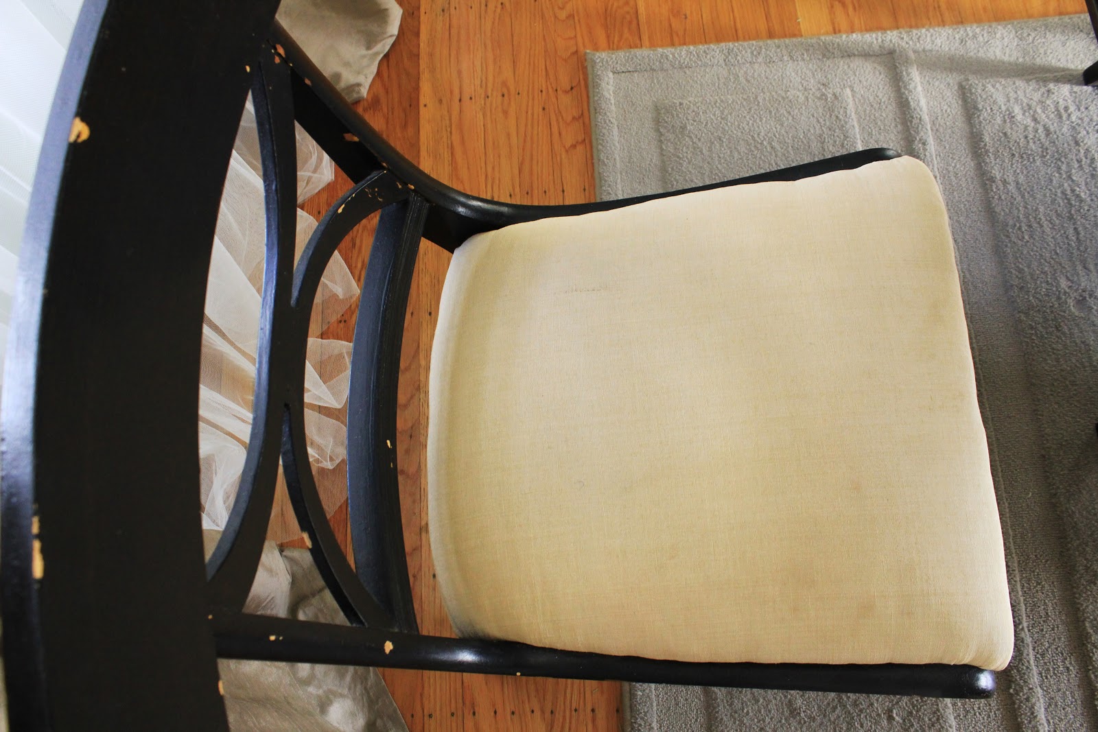 Our dining room chairs were looking very sad. I bought them from Craigslist with an antique (aka old) table for $50 total, and since buying them over three years ago, I have done nothing to fix them up. I like to refer to the chipped paint as “shabby chic” but the cushions were just plain sad. The old linen fabric was yellowed from probably decades of wear, and they were badly stained (from god knows what).