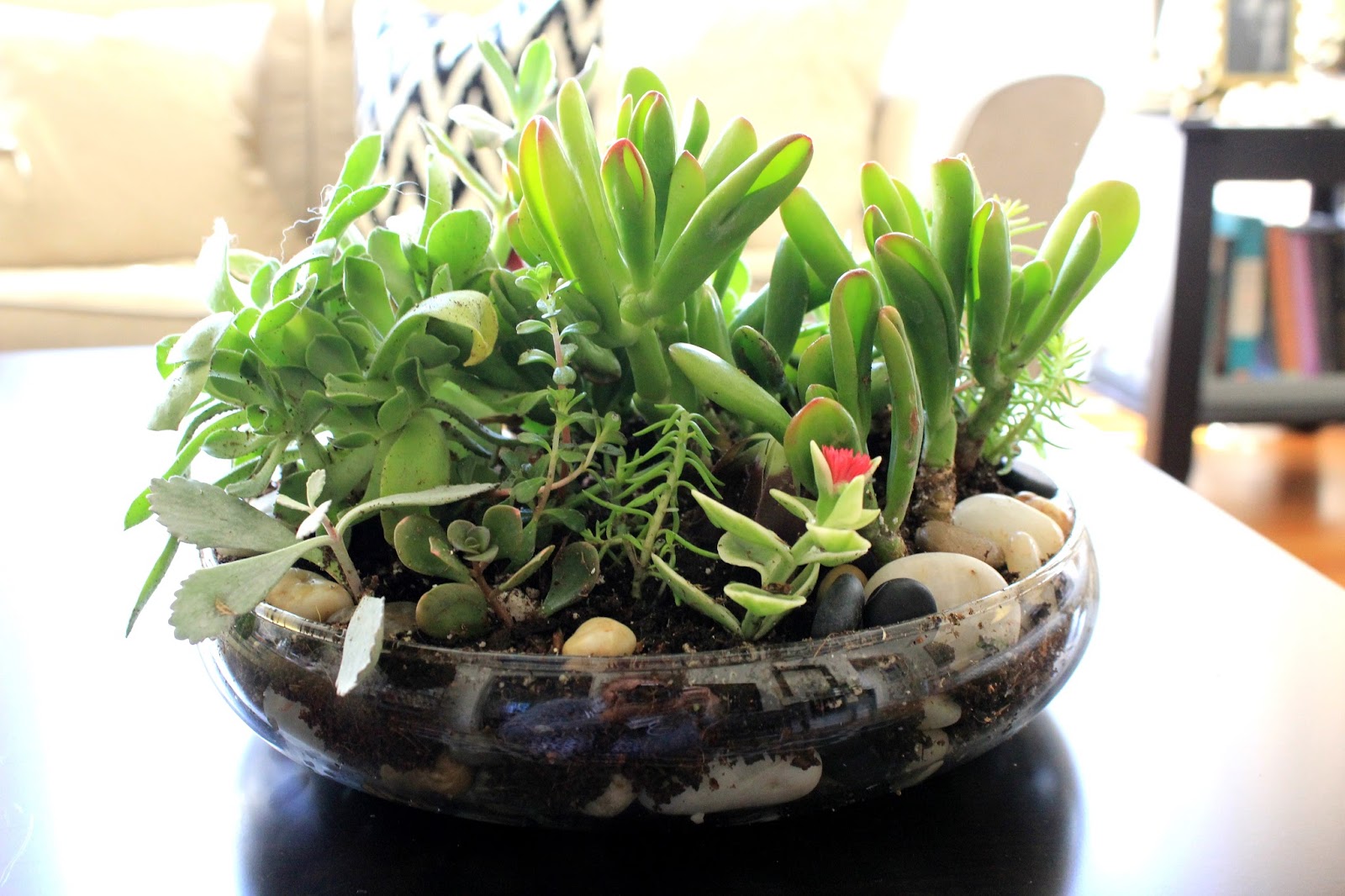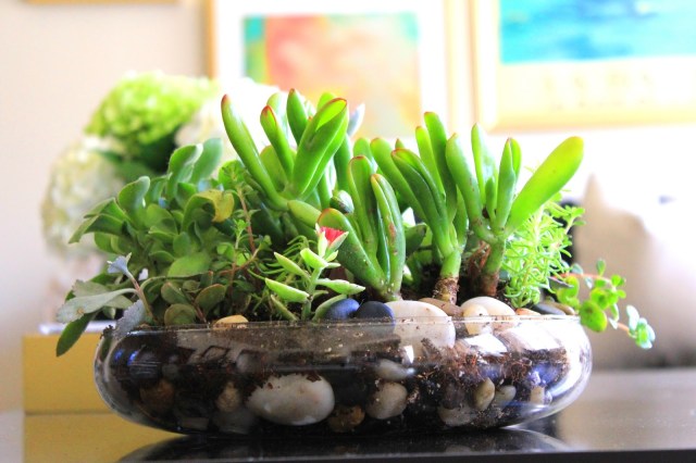 This project was nowhere near that much – the glass bowl was from Ikea, ~$10. The succulents were from Trader Joes, $2.50 each, and I bought about 5. I’ve had the rocks for years, but they were from Michael’s, and were about $5 for a big bag of them. In total, this cost me, about $20.