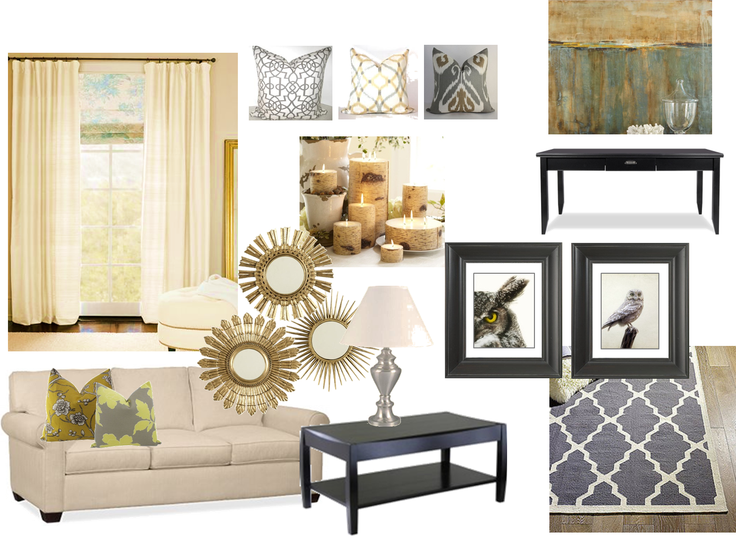 My goal here was to keep the focus on how light and airy the room is. I’m sticking to a palate of light colors – tans, grays, yellows, and creme. The best part? Many of the things in my inspiration board, we already have!
