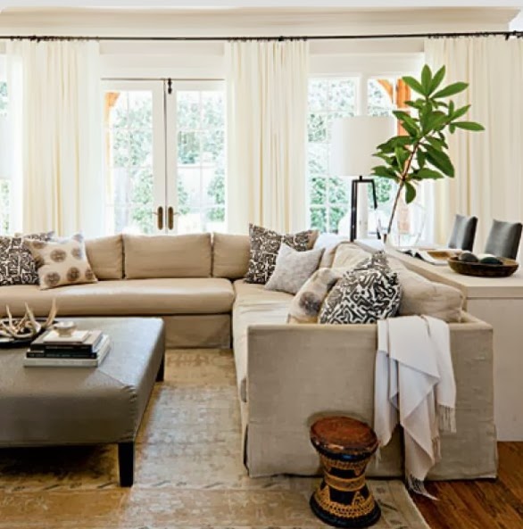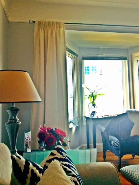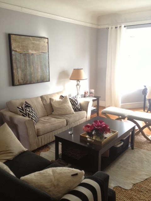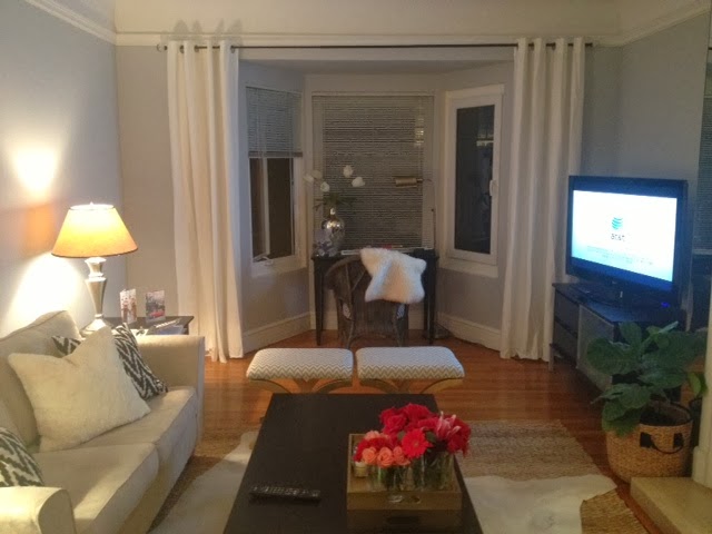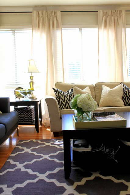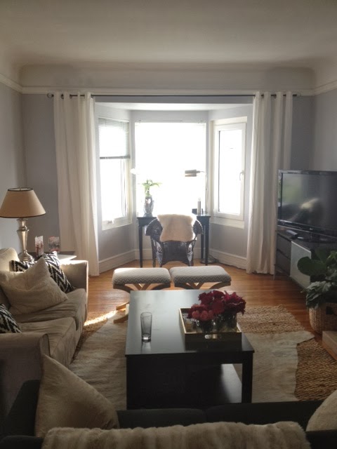 Final details? The new lamps, the woven rug, layered with the cowhide from our last apartment, the new pillows, and long white linen curtains.