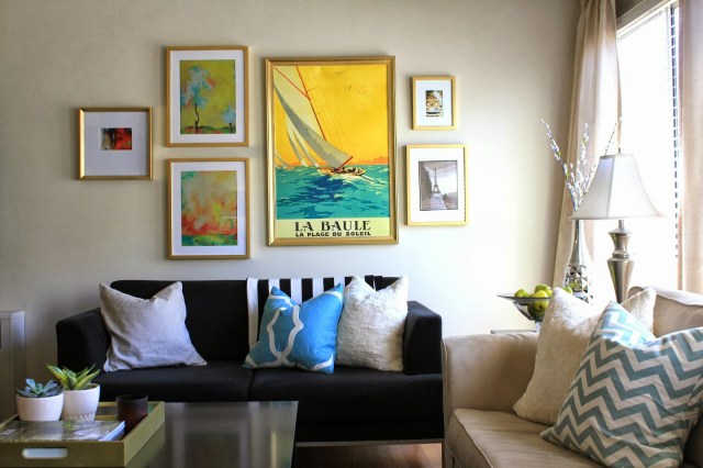 The large frames are from Ikea also. A great find – the wood ties in with the coffee table nicely, and you cannot beat the price for a frame that size. The sailing prints are from Art.com, and as my dad aptly pointed out, I’ve hung them in the reverse order. It’s actually two prints of one single boat!