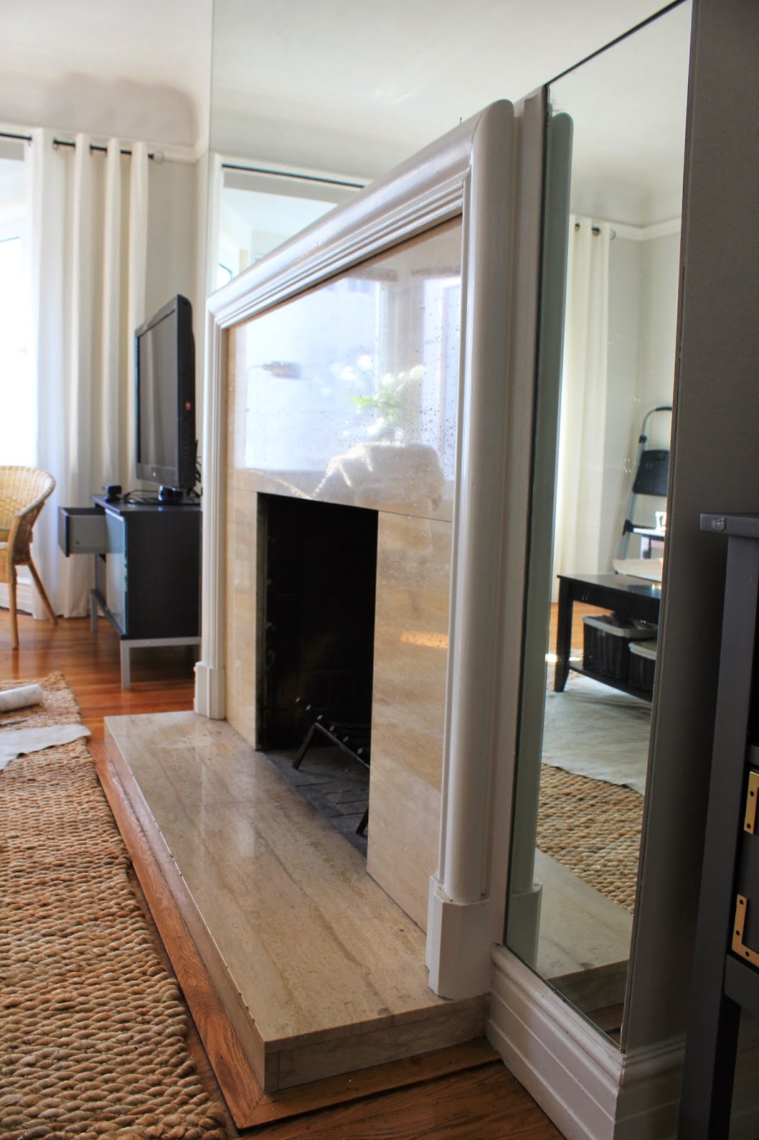 The walls were all scuffed from the multiple moves, had tons of holes from past pictures and shelves, and were painted a yellowed beige color. The fireplace had a really dirty, cracked stone facade in a peach-y color. The curtain rods I’d hung up when I was 24 years old weren’t hung straight, and were staggered to fit into the tight bay window space.