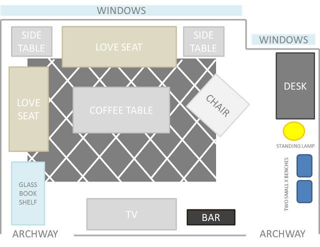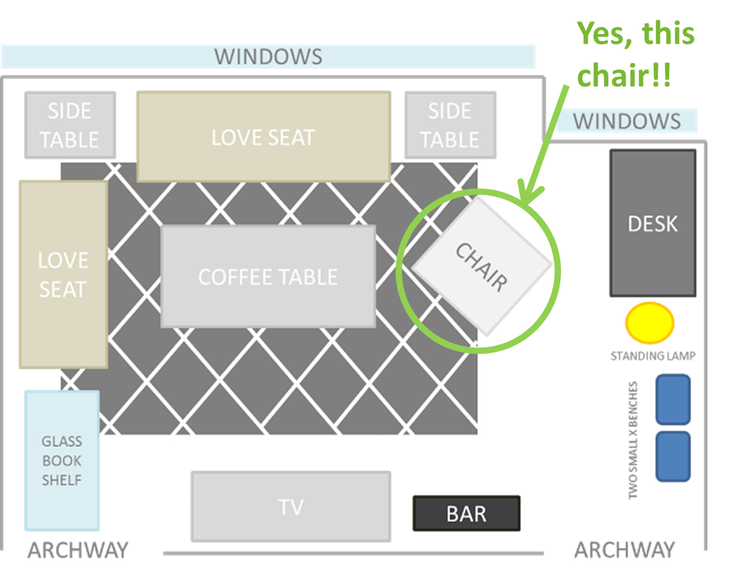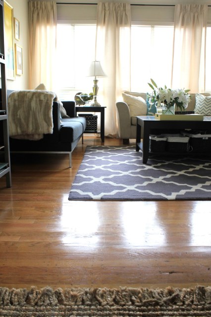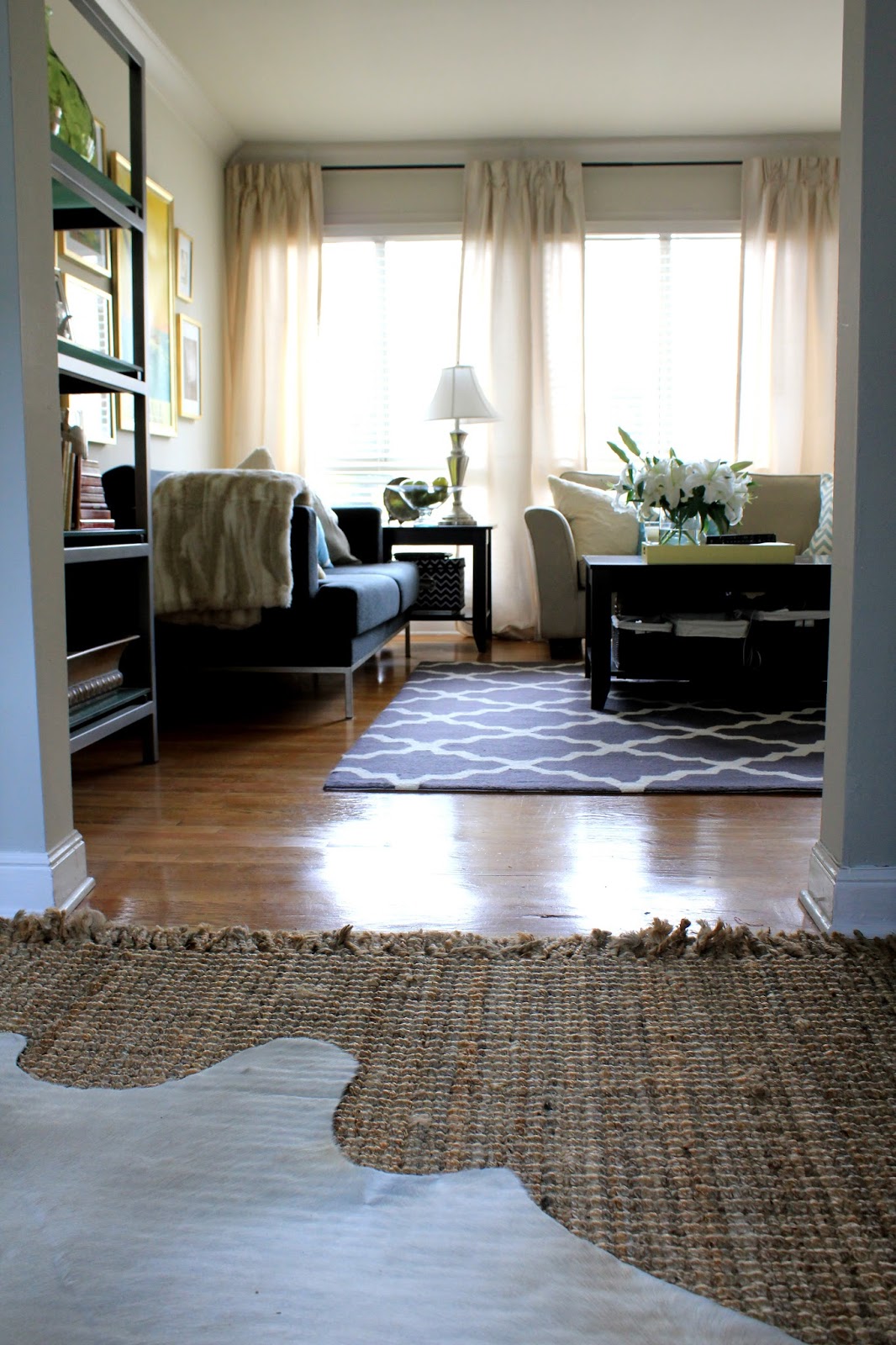 … and scootching back a little bit more to get the cowhide rug that I simply adore… I think having different textures in adjacent spaces has also really helped balance the room and make it feel less “big box store” than it really is.