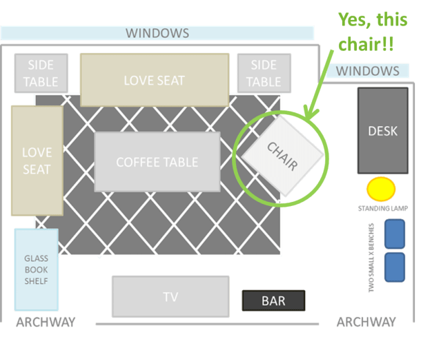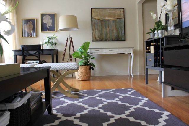 The white console table moved our of our hallway a few months back, and I has been hanging out on the far wall ever since. I’ve had a really hard time trying to think of what should go here. I’m thinking we may ultimately end up selling this console table (despite it’s fabulous new paint job), and maybe the fiddle leaf fig (FLF) can go there with another slightly smaller potted plant next to it?