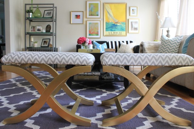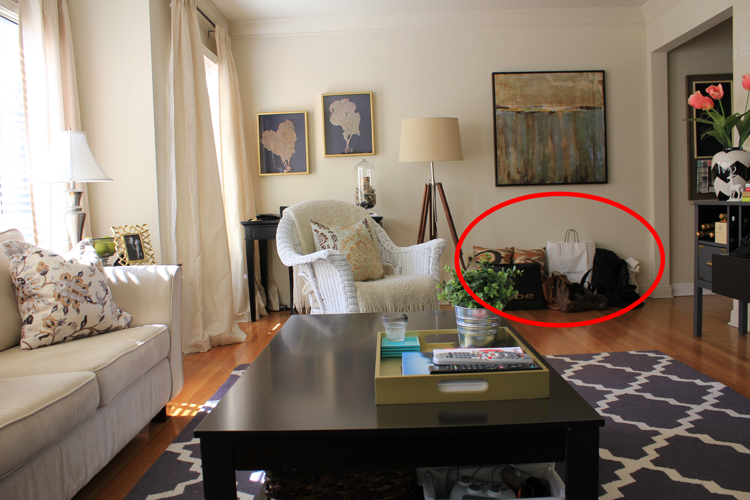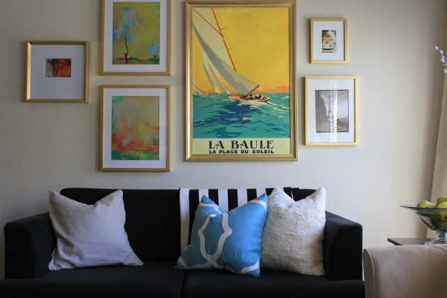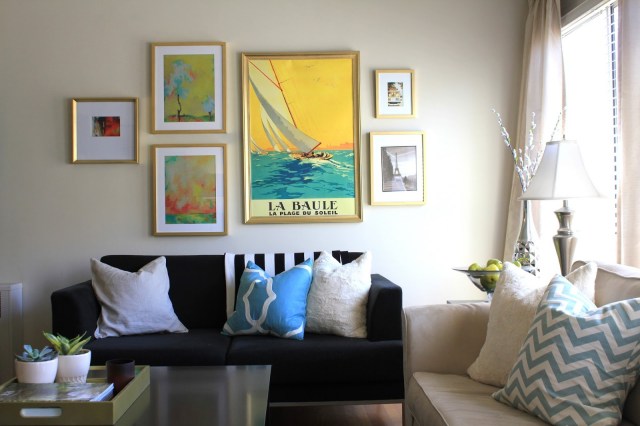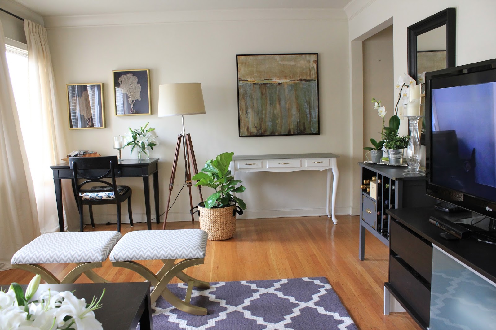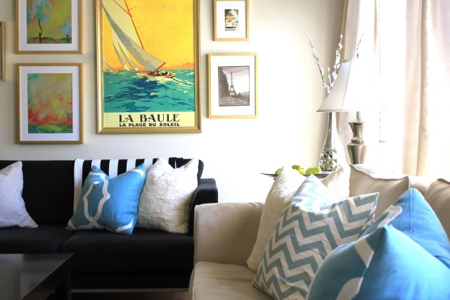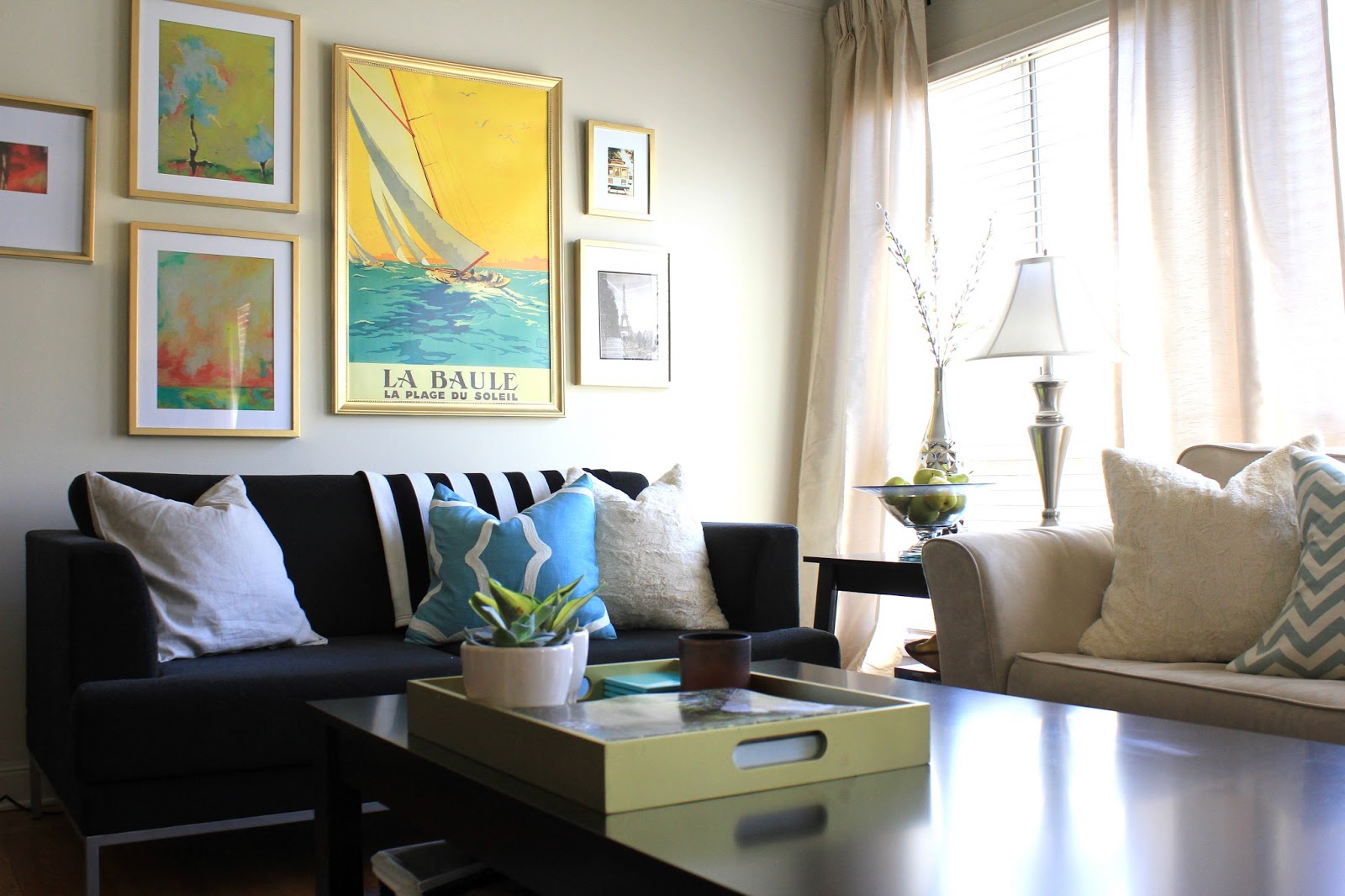 Let’s be honest, everything we have in our living room is either from Ikea (frames, curtain rods, sofas), Target (wine hutch, fabric for throw pillows, baskets under the coffee table, lamps, trays), Bed Bath & Beyond (curtain panels), Craigslist (coffee table with matching side tables, console table), Homegoods (basically every accessory from the glass vases to the candle holders to the faux fruit).