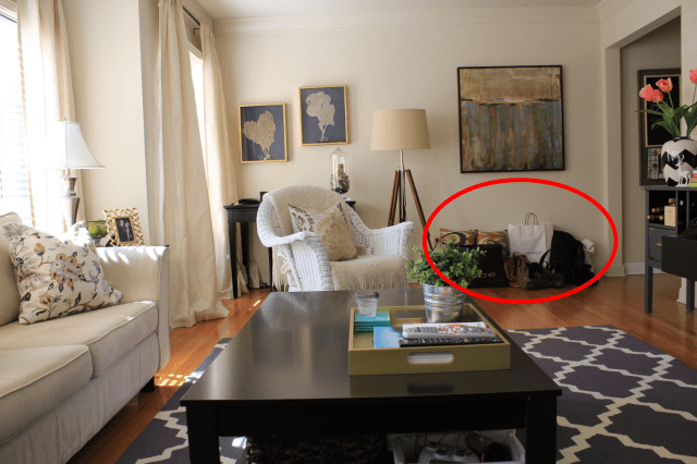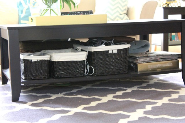I mean, these three baskets in the forefront are stuffed to the gills with wires, cords, TV remotes, video game controllers (because my boyfriend is secretly a 13 year old boy at heart). On the other side of the table – closest to the couch – the baskets are filled with blankets for cozying up on the couch, and the surplus of wine that won’t fit in that mini wine hutch!