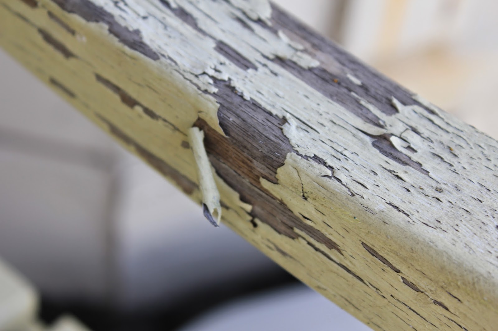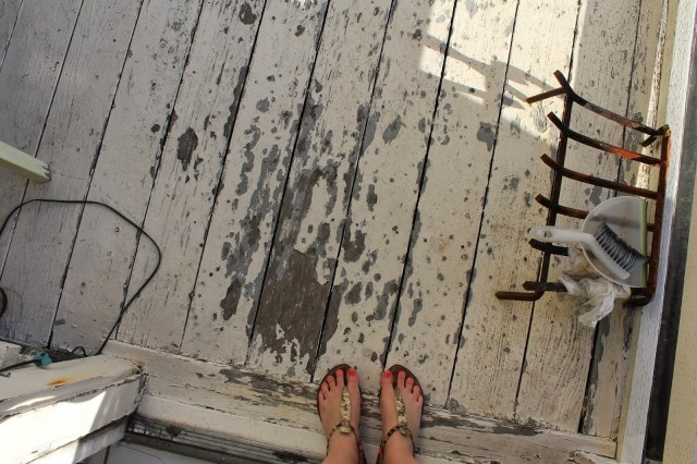 Well, Kris came home a while back to find me sanding as much of that old chippy paint off as possible.
