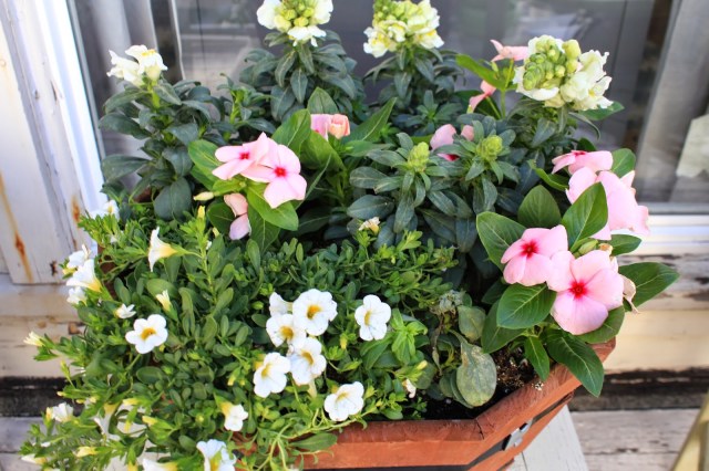 I also tossed out the dead rosemary twig plant – may it rest in peace – and replaced the entire sad pot with a new wooden planter and some pretty flowers.  I planted some snapdragons, and these pretty pink and white flowers in the wooden planter – no idea what they are called but they were in the section labeled “full sun” so I figure they’ll be ok.