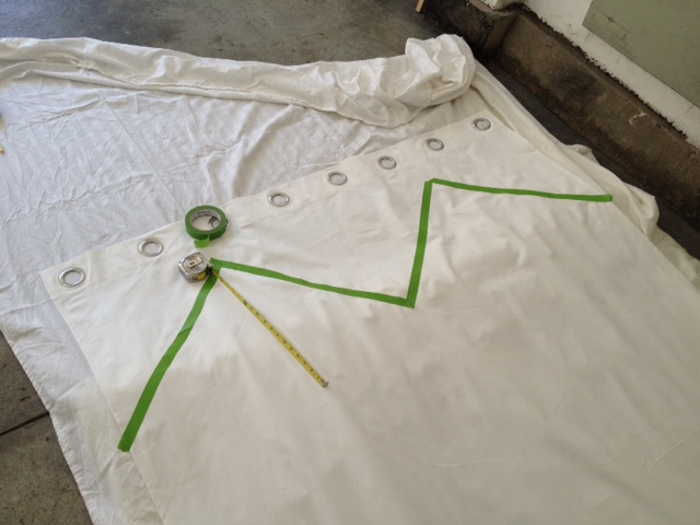 Next step is to get out the measuring tape again, and start marking off where the rings will go. Ignore the wrinkles in this photo, it started out ironed, but got wrinkled after sitting folded on the table for three months.