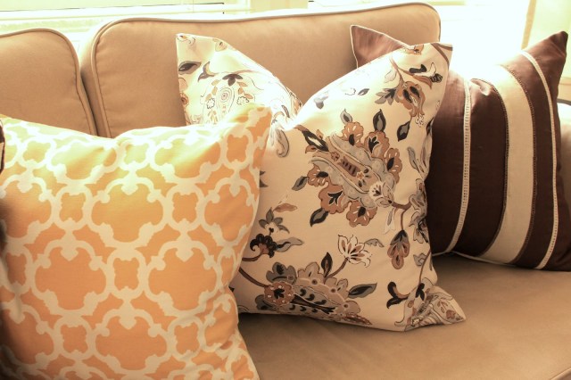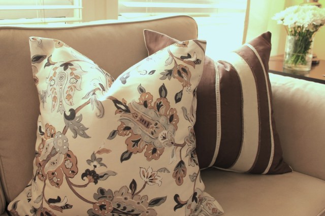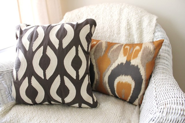 this post on my debate over a grey / brown and yellow Ikat… hey now!), and the grey and white pillow from Target (oh, how I love Target. I went in for toilet paper and came out with throw pillows).