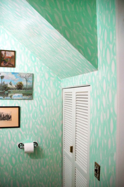 To the rescue is the concept of stenciling… I’ll leave you to Carmel’s tutorial at Our Fifth House for the play by play, but she essentially used a stencil from Olive Leaf Stencils (I believe it was the Ikat Pattern #2) and painted away…