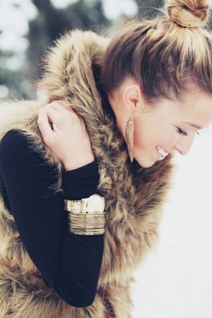 If I were to try and describe my style in a nutshell, it would say that I go for feminine tailored pieces with classic lines, pops of color, and a few “fashion-y” statement pieces mixed in.  My style icons are Jackie O, Miranda Kerr, Kate Spade, and Victoria Beckham.  I rarely go for the overly blousy, off the shoulder tops, or the boho-chic look – regardless of how much I admire it on others – but this new year, I am going to step out of my comfort zone, and take on faux fur.  A faux fur vest to be precise.