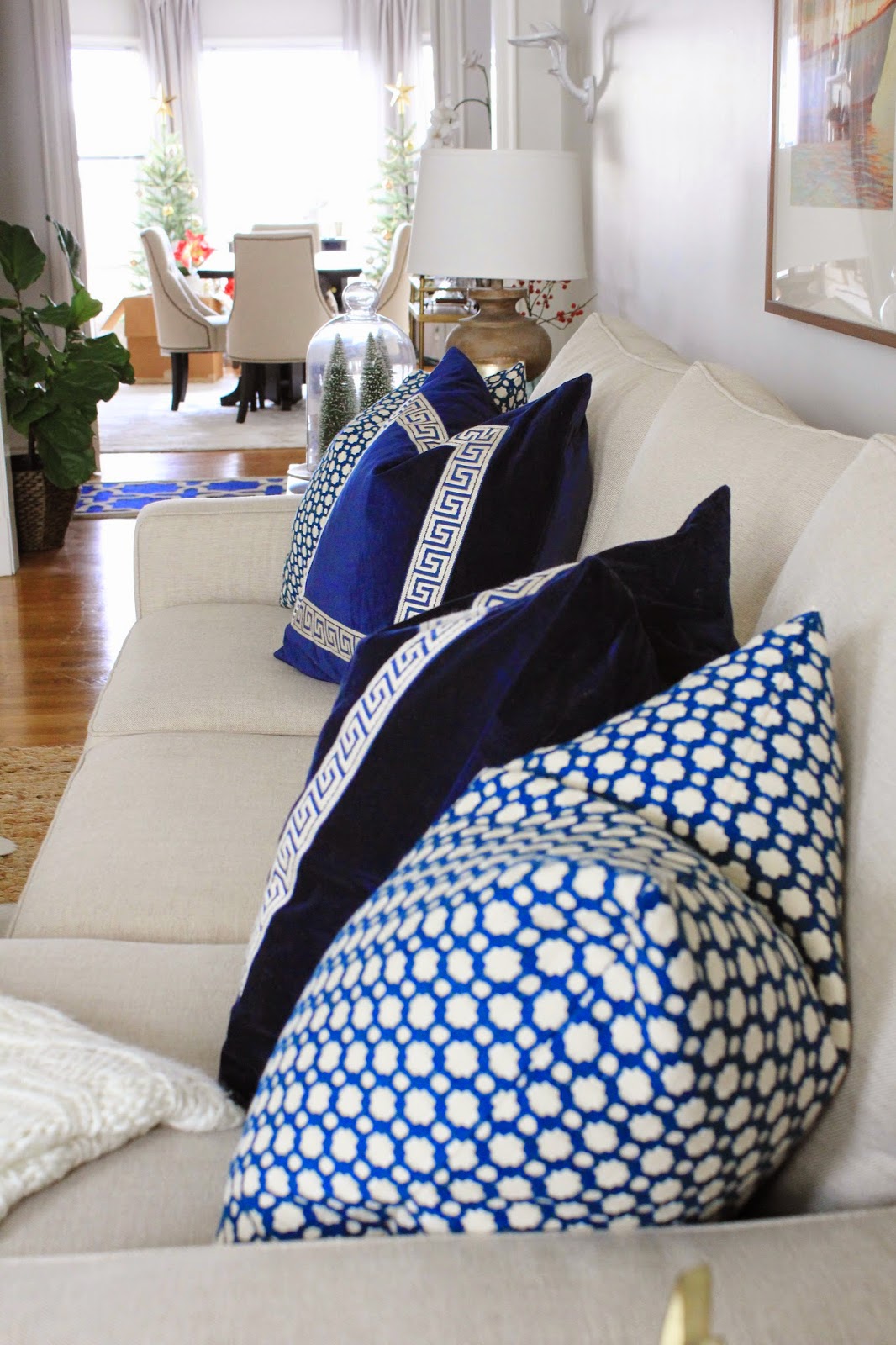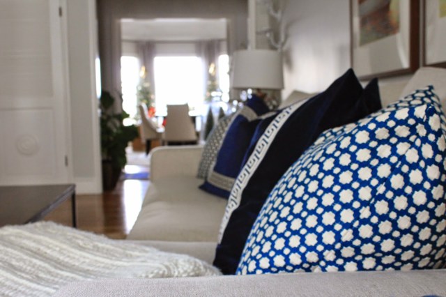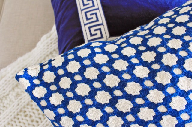I ordered the pillow covers off of Etsy, and agonized over which to get. I loved the large greek key trim, but matching the navy velvet was tough. I wanted a small scale print to coordinate, and ended up with this Schumacher fabric. I love the heavy weight of each – perfect for the colder months right now, and my mom and I are working on others pillow covers that we’ll swap in for the spring / summer months.