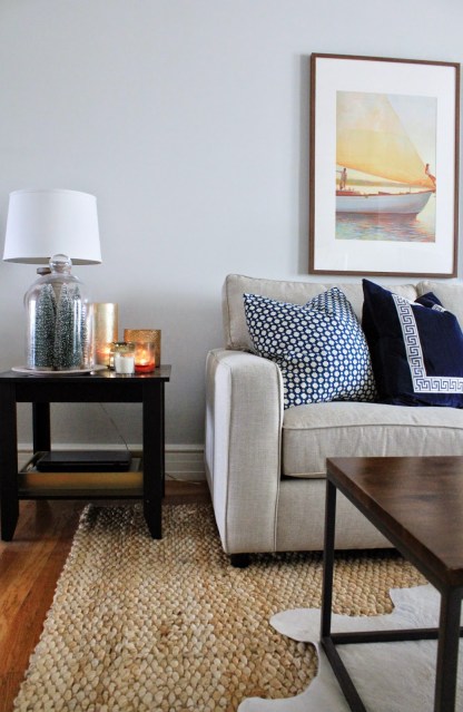 The lamps are from Target, the side tables were the ones we had in our last apartment, and while I wasn’t crazy about them before, they don’t bother me anymore now that the big bulky coffee table is gone. They just sort of blend into the background, and the idea of replacing them is in the very very VERY distant future. Like years maybe.